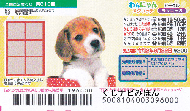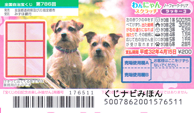 わんにゃんスクラッチの種類はラッキー3。このスクラッチ宝くじの「チョビちゃん」、ノーフォーク・テリア、ビーグル、ねこ・ミックス6・8、シャム、サイベリアン2、ベンガルの各見本画像と遊び方の解説です。 |