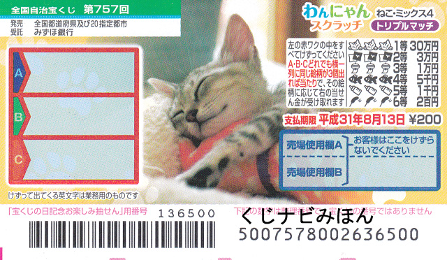 わんにゃんスクラッチの種類はトリプルマッチ。このスクラッチ宝くじの「ねこ・ミックス」、ねこ・ミックス4、9、パピヨン、ロシアンブルー、パピヨン3、ミニチュア・ダックスフンド&ねこ・ミックス2、柴犬&マンチカンの各見本画像と遊び方の解説です。 |