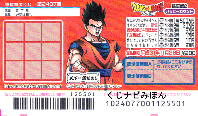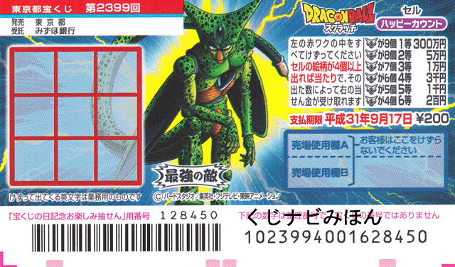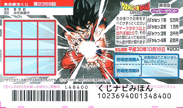| ドラゴンボールスクラッチの種類はハッピーカウント。このスクラッチ宝くじの孫悟空、ベジータ、セル、孫悟飯2、ゴジータの各見本画像と遊び方の解説です。 Sponsored Links |