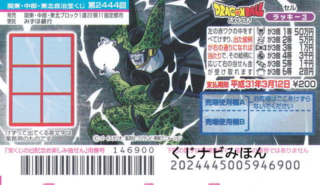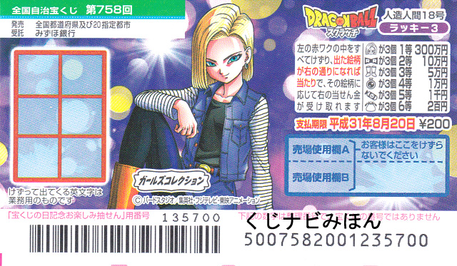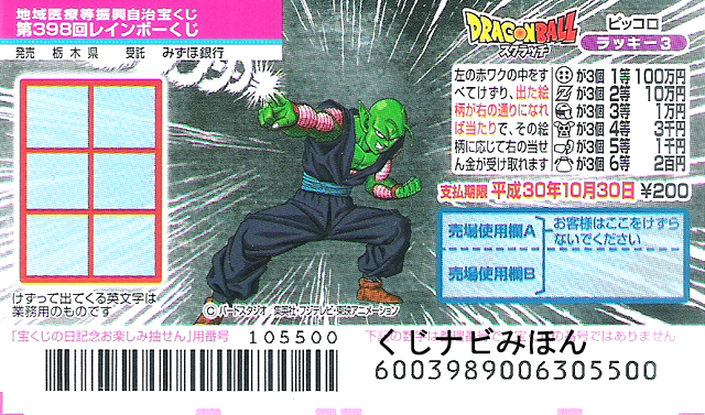 | ドラゴンボールスクラッチ。ピッコロ。ヤジロベー。セル。孫悟空。チチ。人造人間18号。フリーザ2。孫悟空4。ベジータ2。同じ絵柄が3つ出れば当たり。出た絵柄に応じて当選金が決まります。 |