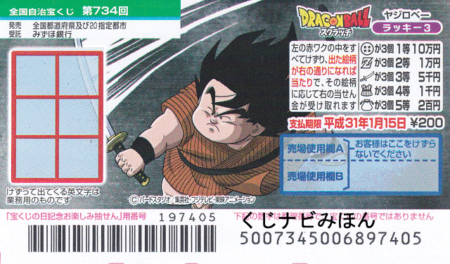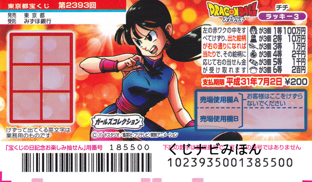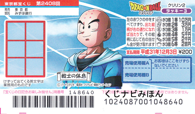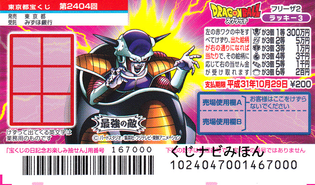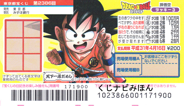 | ドラゴンボールスクラッチの種類はラッキー3。このスクラッチ宝くじのピッコロ、ヤジロベー、セル、孫悟空、チチ、人造人間18号、フリーザ2、クリリン2、孫悟空4、ベジータ2の各見本画像と遊び方の解説です。 Sponsored Links |