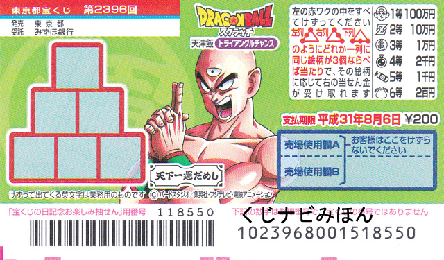 ドラゴンボールスクラッチの種類はトライアングルチャンス。このスクラッチ宝くじの孫悟飯、トランクス、ゴテンクス、天津飯、人造人間18号2、ベジータ4の各見本画像と遊び方の解説です。 |