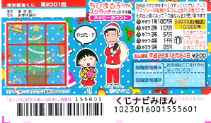 | ちびまる子ちゃんスクラッチ。クリスマス編。 クリスマスツリーの絵柄が5つ以上出れば当たり。出た数で当選金が決まります。プレゼントボックス絵柄が一つ出たらクリスマス賞の当選。 |