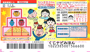 | ちびまる子ちゃんスクラッチ。豆まき編。ピラミッド型に並んだ枠をすべて削り、同じ数字が左列・右列・下列のどれか1列に3つ並べば当たり。出た等級に応じて当選金が決まります。 たまちゃんの絵柄が1つ出たときは特別賞の当たり。 |