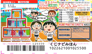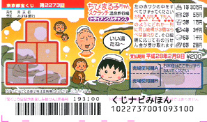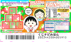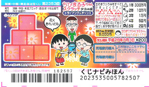 | ちびまる子ちゃんスクラッチ。まる子編。ピラミッド型に並んだ枠をすべて削り、同じ数字が左列・右列・下列のどれか1列に3つ並べば当たり。出た等級に応じて当選金が決まります。 まる子の絵柄が1つ出たときは特別賞の当たり。 |