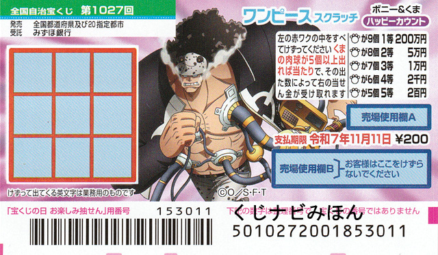 ワンピーススクラッチ。当たりの絵柄が指定の数以上出れば当たり。出た数で当選金が決まります。 |
