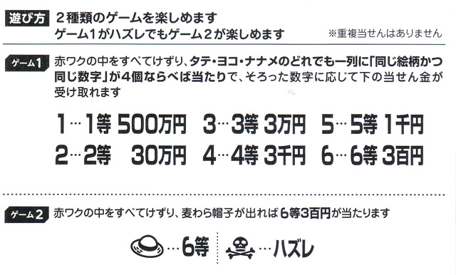 1等500万円のワンピース大型300円くじ。ゲーム1、赤枠の中をすべて削り、タテ・ヨコ・ナナメのどれでも一列に「同じ絵柄かつ同じ数字」が4個ならべば当たり。揃った数字に応じて当選金が決まります。ゲーム2、右下の四角い赤枠を削って麦わら帽子が出たら6等の当たり。 |