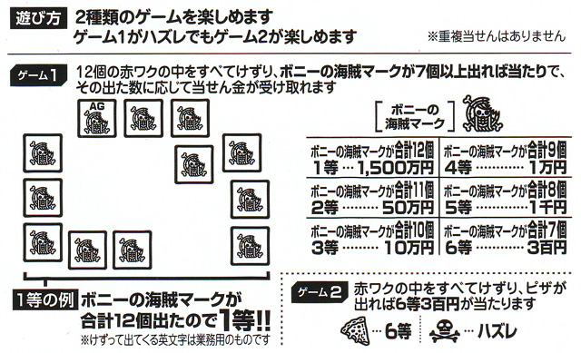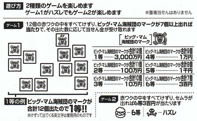 麦わらの一味7/ルフィ15 1等1000万円の大型300円くじ。ゲーム1、上の12個の四角い赤枠の中をすべて削って、ルフィの海賊マークが7個以上出たら当たり。その出た数に応じて当選金が決まります。ゲーム2、右下の四角い赤枠の中を削り麦わら帽子が出れば6等の当たり。