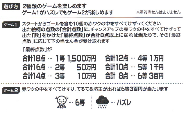 1等1500万円の大型300円くじ。ゲーム1、まずスタートからゴールを含む10個の丸い赤枠を全て削り、出た絵柄点数の合計(足し算)を出します。その合計点に右のチャンスアップの赤枠を削って出た数字をかけた(掛け算)「最終点数」が8点以上で当たり。「最終点数」に応じて当選金が決まります。ゲーム2、右下四角い赤枠を削って、てるてる坊主が出たら6等の当たり。 |