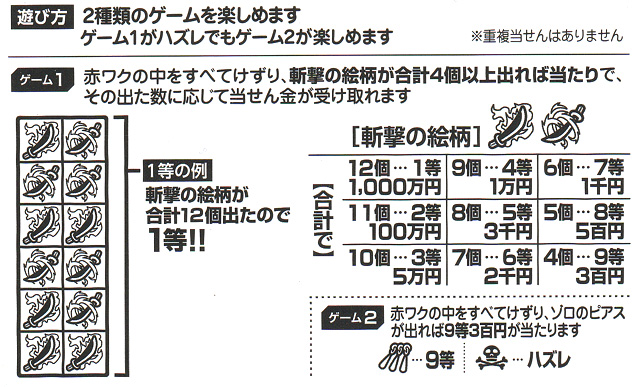 1等1000万円の大型300円くじ。ゲーム1、左上の赤枠の中を全て削って斬撃の絵柄が合計4つ以上出たら当たり。その出た数に応じて当選金が決まります。ゲーム2、右下の四角い赤枠を削ってゾロのピアスが出たら9等の当たり。 |