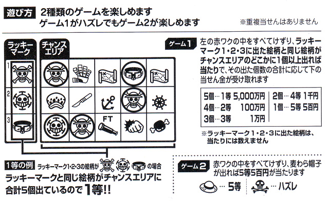 1等5000万円の大型500円くじ。ゲーム1、左の赤枠の中を全て削り、ラッキーマーク1・2・3に出た絵柄と同じ絵柄がチャンスエリアのどこかに1つ以上出れば当たり。その出た個数の合計に応じて当選金が決まります。ゲーム2、右上の赤枠の中を削り麦わら帽子の絵柄が出れば5等の当たり。 |