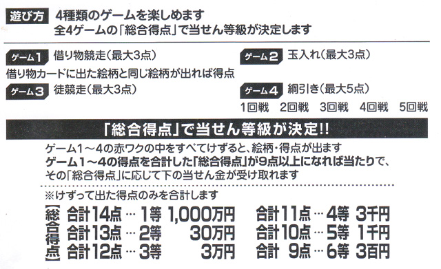 4種類のゲームが楽しめます。ゲーム1〜4の赤枠の中を全て削ると絵柄・得点が出ます。ゲーム1〜4の得点を合計した総合得点が9点以上で当たり。その総合得点に応じて賞金が決まります。 |